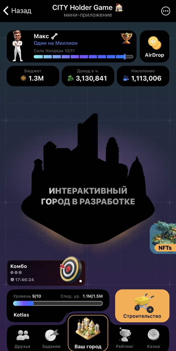 РЕГИСТРАЦИЯ Всем привет! Подготовил обзор интересной и перспективной телеграм игрушки, в которой могут хорошо насыпать. Итак, City Holder – приложение в телеграм, разработчики которого отошли от стандартного формата тапалок и запустили бота с механикой Build-to-Earn. Чтобы не пропустить свежие новости о предстоящем листинге и других аирдропах, подпишитесь на Телеграм канал t.me/millioner_project Пара слов об игре City Holder – это игра в телеге, которая запускается через бота и позволяет собирать игровую валюту, которую в дальнейшем можно конвертировать в реальные деньги. Жанр этой игрушки можно охарактеризовать как «градостроительный симулятор». Что тут надо делать: собирать монеты (есть тапалка);