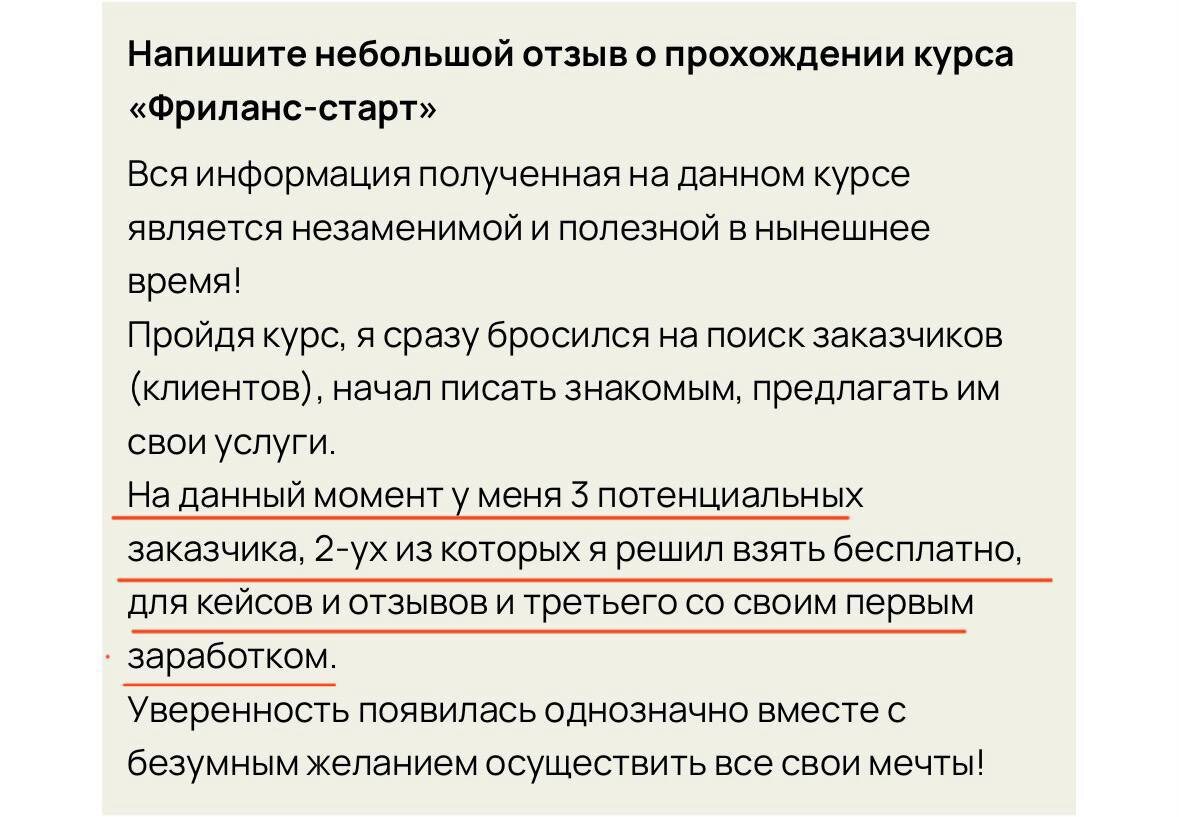 Сейчас осень, самое продуктивное время года Сегодня можно начать новую жизнь ☺️ И наш «Фриланс-старт» вам точно в этом поможет, потому что: Он бесплатный 💯 Он всего 3 дня 💯 Он содержит в себе максимум пользы 💯 А заказчиков искать можно даже среди своих друзей и знакомых, как это делают наши ученики. Это могут быть работы для портфолио и за отзыв, что поможет вам в будущем быть уверенней в своих силах и повысить доверие потенциальных заказчиков. Но и за оплату тоже договариваться очень даже стоит 😉 И, как видите в отзыве, это вполне реально 💯 Зарегистрироваться можно ЗДЕСЬ 👈 Обучение начнется сразу 🔥 🎁Регистрируйтесь на наш бесплатный курс по старту на фрилансе Зарегистрироваться по ссылке👇