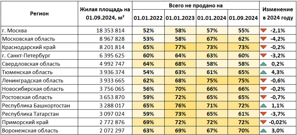 Как мы знаем, на цены в рыночной экономике должны влиять баланс спроса и предложения 🙂. Учитывая, что спрос на новостройки в Москве, Санкт-Петербурге и основных регионах строительства РФ упал, а цены существенно так и не снизились, возникает вопрос – а что с непроданными запасами (т.е. избытком предложения)? А картина следующая: Несмотря на значительный объем нераспроданного жилья в российских новостройках – в среднем 65%, – в динамике ситуация выглядит неплохо: объем непроданных квартир с начала 2023 г. снижается, и в 2024 г. данный показатель продолжает улучшаться в большинстве регионов. Возможно, пары месяцев после отмены льготной ипотеки с предшествующими пиковыми продажами недостаточно для того, чтобы делать выводы, но и со стороны запасов пока не видно предпосылок к снижению цен. Продолжаем наблюдение! Больше аналитики в телеграм-канале DomAnalyticsInfo P.S. Посмотреть сколько квартир не продано в вашем регионе (если нет в списке выше) можно в телеграм-боте DomAnalyticsBot, в ра
