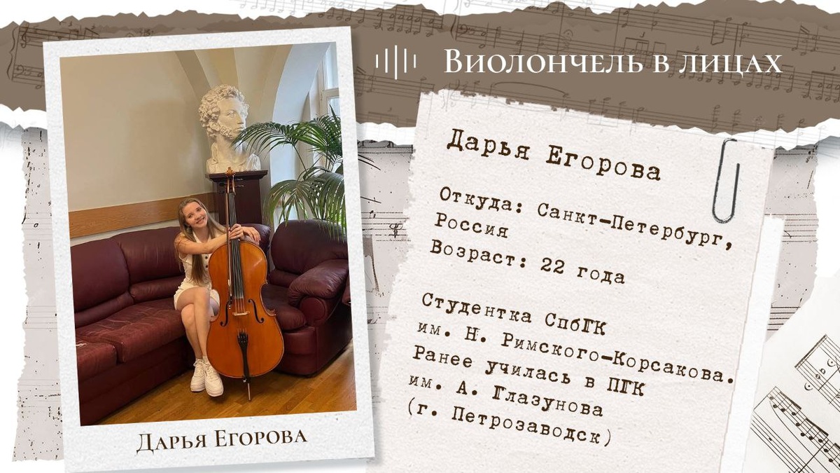 Наша вторая героиня - виолончелистка и студентка СпбГК им. Римского-Корсакова Дарья Егорова.