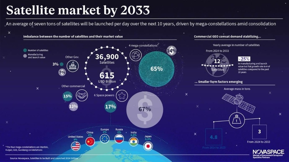 С 2024 по 2033 годы ежегодно в космос будет запускаться в среднем более 3700 спутников, что эквивалентно примерно 10 спутникам в день, суммарной массой 7 тонн. При этом стоимость пусковых услуг и производства геостационарных спутников за десять лет снизится на 25 %. Об этом говорится в 27-м отчете «Спутники, которые будут построены и запущены» специализированной консалтинговой компании Novaspace. В исследовании говорится, что четыре коммерческие спутниковые группировки на околоземной орбите: Starlink, Kuiper, G60 и GuoWang составят 65 % космических аппаратов в количественном выражении, но при этом составят лишь 14 % от общей стоимости производства и запусков, поскольку при их производстве возникает экономия от масштаба. Тогда как 2900 более крупных спутников, массой более 500 кг, запущенных 170 операторами, составят 70 % от общей стоимости производства и запусков, но всего лишь 7 % от общего числа спутников. Спрос на коммерческие спутники связи на геостационарной орбите (GEO) останется