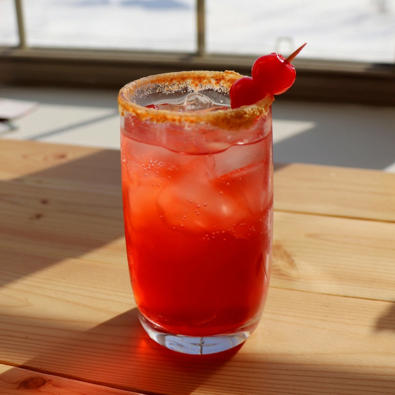 ИНГРЕДИЕНТЫ: 20 мл вишневого сиропа, 70 мл вишневого сока, 30 мл бурбона, 400 мл светлого пива.