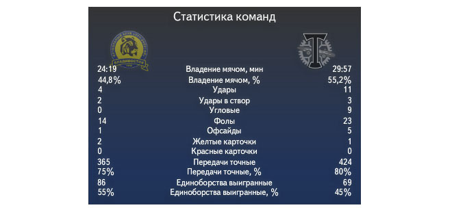 Стоит также отметить, что в целом этот матч проходил на невысоких скоростях, которые говорили о том, что в этом матче больше чем один гол вряд ли стоило ожидать, но в итоге распечатать ворота соперников не удалось ни гостям, которых наверняка устроила и ничья с Дальнего Востока, ни хозяевам поля. А обратная замена нападающего Александра Тихоновецкого на полузащитника Дениса Селищева на восемьдесят четвёртой минуте игры, которая стала полной неожиданностью для всего стадиона, сопровождающего данный ход свистом в адрес главного тренера владивостокской команды, и вовсе погасила атакующий пыл «жёлто-синих». Как итог, сухая ничья в матче, который обслуживался арбитром из подмосковного города Люберцы, Алексеем Сухим.