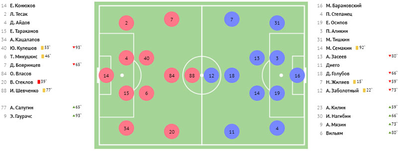 Предупреждения: Жиляев (15), Заболотный (22), Микуцкис (45+1), Кулешов (53), Шевченко (77), Семакин (90+2).