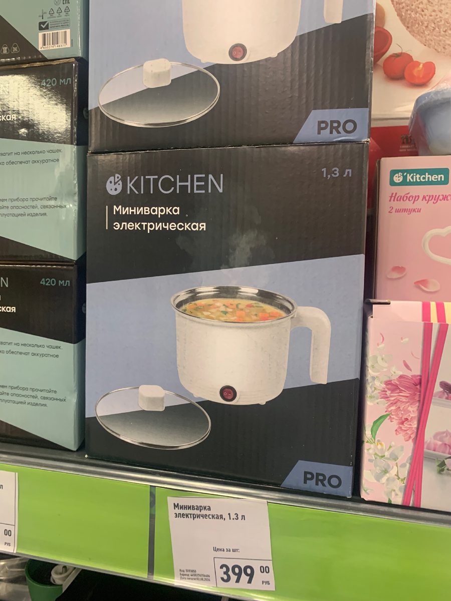 Первое, что бросилось мне в глаза — это новая миниварка O’KITCHEN. Сразу скажу, что за объем 1,3 литра и чашу из нержавеющей стали с крышкой из качественного стекла можно отдать 399 рублей не задумываясь. Приготовить что-то вкусное и быстро — одно удовольствие. Производитель Китай, кто бы сомневался. Но знаете что? Вещь в хозяйстве полезная, и за такую цену — просто подарок.