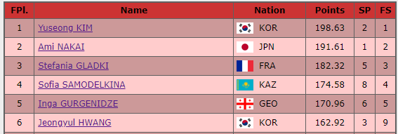 Победительницей очередного этапа юниорской серии Гран-при ISU стала уже достаточно известная 15-летняя корейская фигуристка Ю Сон Ким (198.63 - 1 место🥇), финалистка предыдущего финала ГП ISU. Ким исполняет тройной аксель, который получился и на этот раз, а кроме этого приятно выглядит в плане презентации. В Мире ISU она сейчас очевидно входит в число лучших юниорок, хотя на последнем юниорском Мире выступила неудачно (лишь 15 место). Японка Ами Накаи (191.61 - 2 место🥈) участница уже двух последних финалов Гран-при ISU и тоже входит в число элитных фигуристок Мира ISU. Ами проиграла кореянке по причине того, что свою попытку исполнения тройного акселя выполнила неудачно.