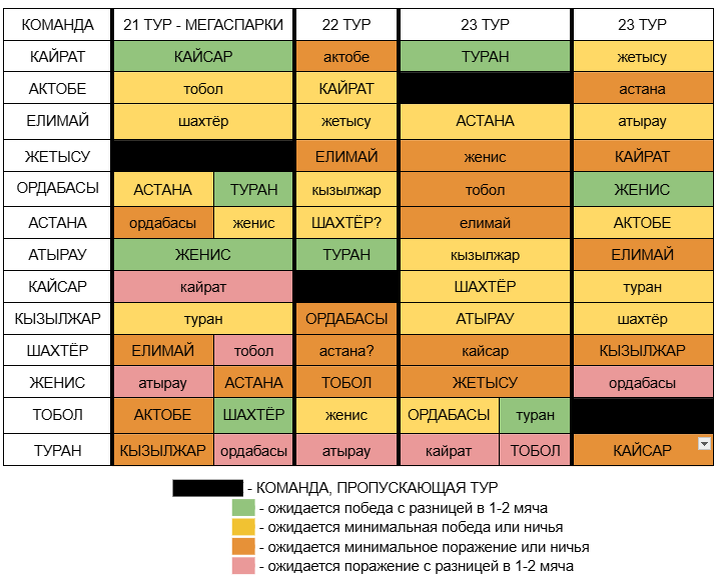 Дедлайн - 21 сентября (суббота) в 15:00 по московскому времени, в первом слоте сыграют «Атырау» и «Женис». Также рекомендую подписаться на уникальный телеграм-канал о фэнтези Казахстана. И присоединиться к чату с информацией по теме, в т.ч. от подписчиков. Календарь на четыре тура На календаре стоит остановиться поподробнее. В этом туре не сыграет «Жетысу». У «Ордабасы», «Астаны», «Шахтёра», «Жениса», «Тобола» и «Турана» будет по два матча в туре. Предпочтительно иметь игроков именно из этих команд. Атырау - Женис составы команд будут известны за час до дедлайна У «Атырау» нет двойных туров, но достаточно простой календарь. Если Сигневич будет в стартовом составе, его можно оставить у себя в команде. Традиционно можно взять и защитника. У «Жениса» в этом туре два матча, правда, в обеих встречах столичная команда является аутсайдером. Стоит рассмотреть дешёвые варианты, например, вратаря Анарбекова или защитника Беланчича (последний, правда, висит на дисквалификации, но есть ещё Новак з