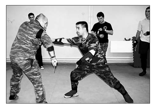 Начинается знакомство с защитами через понимание, что руками управляет корпус: сначала уводится корпус, потом ему помогают руки. Так и видно на фотографии, что поворот корпуса обеспечил «сбив» руки, совершавшей укол. Дальше уже исполнитель слева может перейти и на укол своим ножом, и на дуговой порез шеи, и на атаку паха и бедра.