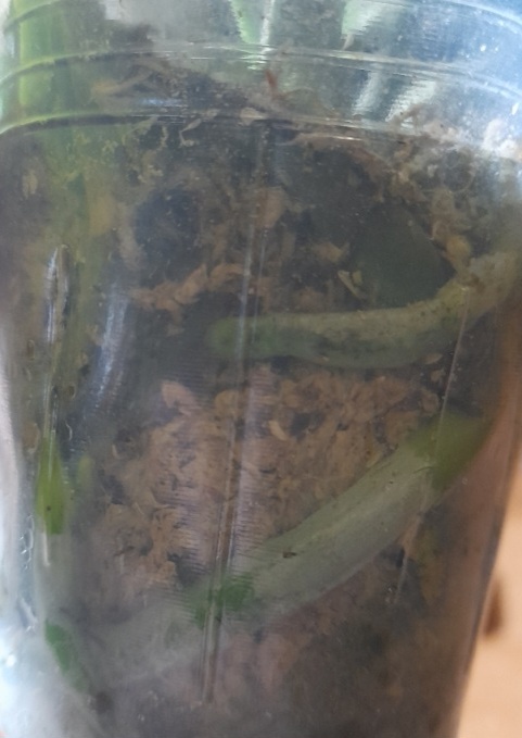 Вот и отцвёл первый распустившийся цветок на фаленопсисе спустя месяц и две недели (не знаю, много это или мало). И это меня сподвигло обозначить в посте одну из главных проблем для орхидей в моих условиях: вода довольно-таки жёсткая. Даже будучи отстоянной несколько дней, она всё же покрывает корни коричневатым налётом. Как бы не нарос этот налёт так, что от корней не осталось только название и не разъело. Несмотря на то, что этот а-ля Goldstaff был уже до меня с неважной корневой с толстым слоем налёта, я всё же решил не пересаживать его изо мха до тех пор, пока он не отцветёт полностью. Чтобы пережить пересадку, нужно чтобы нарасло то, что нужно будет пересаживать, я так считаю. Вроде какие-то поползновения есть, но у тех корней, что внутри. Из стебля один корень начал расти, но тут же закуклился, и ещё один застопорился, но потом передумал и продолжил рост. Лист вырос меньше предыдущих, возможно ввиду состояния корней, с которыми он пришёл. У парфюмерной фабрики смущает, что корни