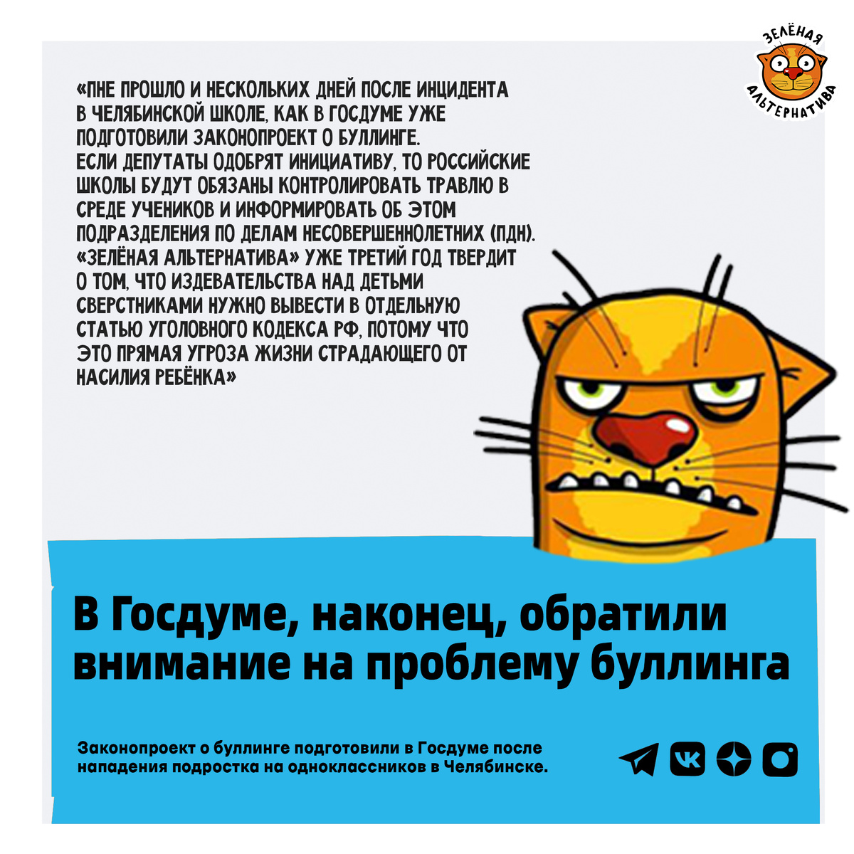 Не прошло и нескольких дней после инцидента в челябинской школе, как в Госдуме уже подготовили законопроект о буллинге. Если депутаты одобрят инициативу, то российские школы будут обязаны контролировать травлю в среде учеников и информировать об этом подразделения по делам несовершеннолетних (ПДН). «Зелёная Альтернатива» уже третий год твердит о том, что издевательства над детьми сверстниками нужно вывести в отдельную статью Уголовного кодекса РФ, потому что это прямая угроза жизни страдающего от насилия ребёнка.