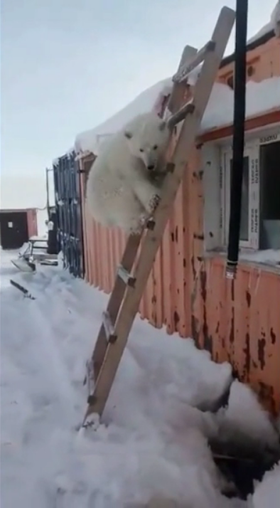 К одному из вагончиков, где вынуждены жить вахтовики, прислонена вертикальная лестница, на которую отважно забрался медвежонок, чтобы заглянуть в окно жилища, где так много всего интересного.
