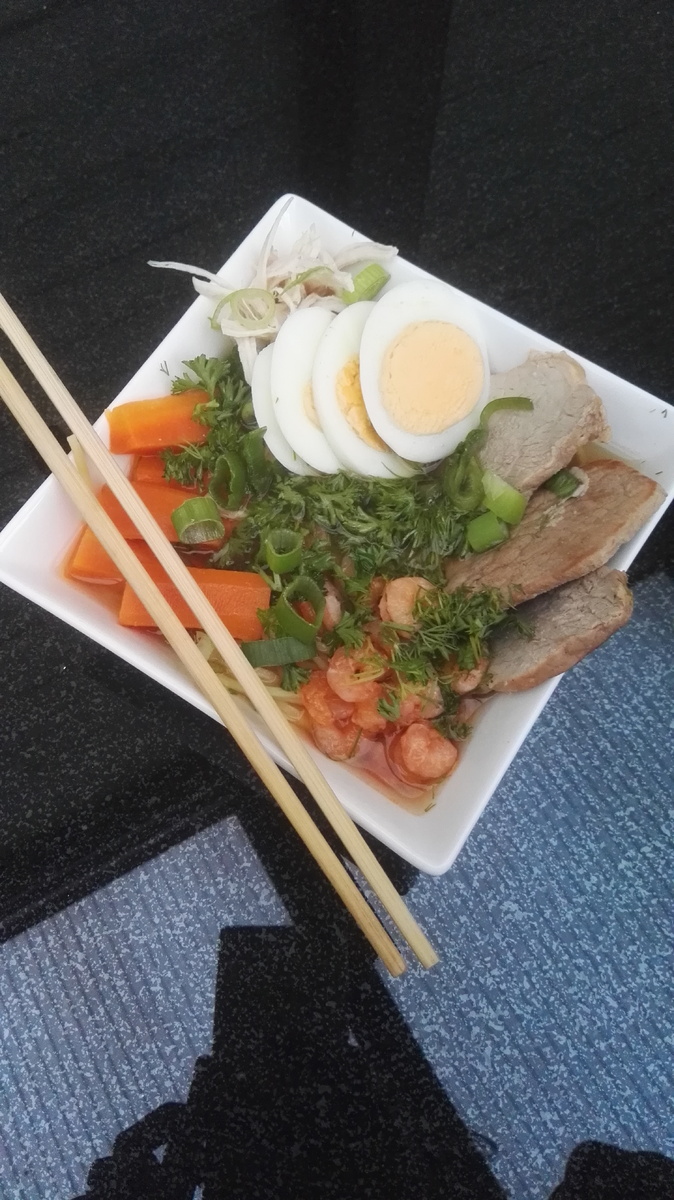 Меня тут просили написать, как я готовлю Рамэн (или Рамен). Ответить сложно, т.к. он готовится очень сильно по-разному. Если в двух словах, то Рамен, что-то сродни нашей пицце, т.е. "я его слепила из того, что было". Ранее я заморачивалась и нашла рецепт на 3-х бульонах: свином, курином и рыбном. В моём случае креветочном, т.к. стружки тунца я не нашла.