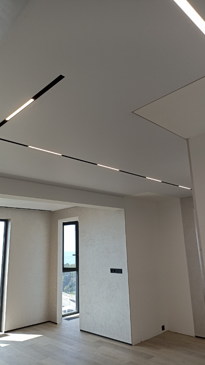 Одно из современный решений в натяжные потолке. Дизайнеры стали постоянно использовать трековую систему, так как это смотрится очень дорого и красиво. Светильники в один уровень с потолком, которые можно в любое место передвинуть, либо поменять на другой. Трековое освещение можно использовать для любых целей. Подсветка рабочей зоны или подсветить стену. Но есть одно но. Это одно не из дешевых потолочных освещений в среднем от 10000 тысяч за м.п.. Есть альтернатива однофазный накладной трек vucs6c26nrvhd7cq