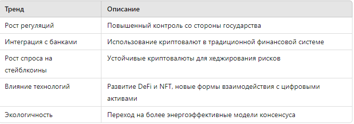 Что же ждет криптовалюты в будущем? Во-первых, это их дальнейшая интеграция в мировую финансовую систему. Крупные компании и банки будут продолжать внедрять блокчейн, предлагая новые продукты на основе криптовалют. Во-вторых, рост популярности токенов и стейблкоинов обеспечит стабильность на рынке, позволяя пользователям использовать криптовалюты не только для спекуляций, но и для повседневных операций.