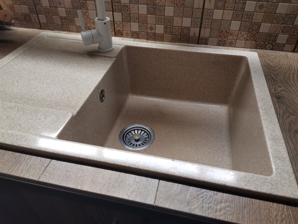 - Мойки из искусственного камня обладают отличной звукоизоляцией. Они поглощают звуки столкновения посуды, предотвращая неприятные шумы и резонанс в кухне. Это особенно важно для тех, кто ценит тишину и комфорт при приготовлении пищи.