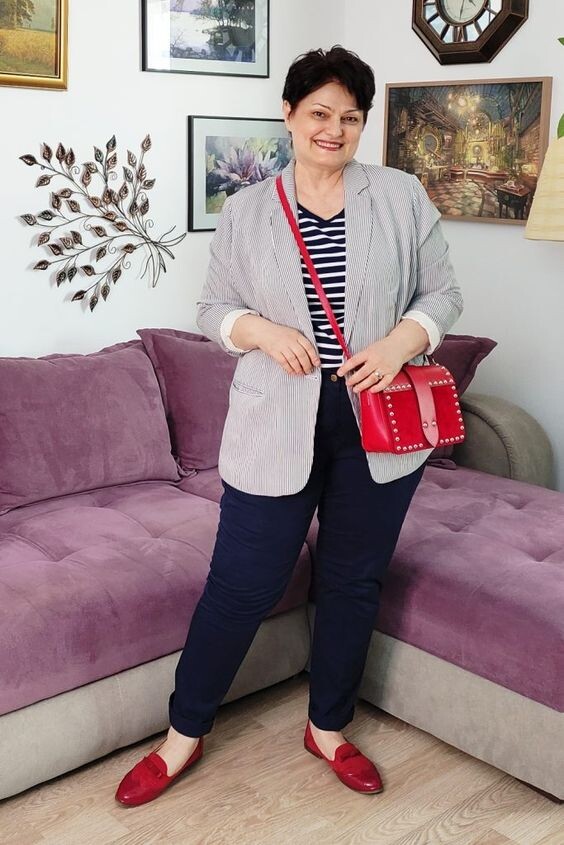 - Сочетание темных брюк прямого кроя, черно-белой кофточки в полоску и серого пиджака выглядит стильно и современно. При желании можно добавить в образ ярких деталей. К примеру, бордовые кожаные туфли на плоском ходу и красную сумочку через плечо.