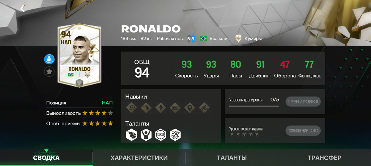 Наша первая позиция нападающий- RONALDO!! У Бразильца высокие удары, скорость и дриблинг, также нормальные пасы. Позиция ЛВ- HRISTO STOICHKOV! У игрока хорошие удары, дриблинг и скорость, а также средние пасы и физ.подготовка. Позиция ПВ- GARRINCHA! У футболисты отличная скорость, пасы, дриблинг и средние удары. На позицию ЛФЛ никого не было, но зато но позиции ЦФД стоит король футбола-PELÉ!! У него самый высокий рейтинг из базовых кумиров, самая высокая скорость, дриблинг, удары и пасы. Но конечно физ.подготовка оставляет лучшего На позиции ПФД никого не представлено. Это была 1 часть базовых карт кумиров на все позиции. В следующей части я расскажу про всю полузащиту.