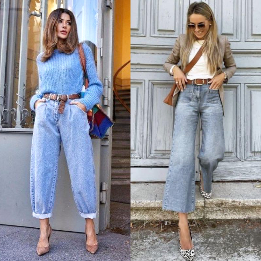 В тренде будут укороченный джинсы либо же можно сделать акцентный подкат из обычной длины. Касаемо цветов, стоит выбирать классический синий, графит, черный или с эффектом старины. Гармонично джинсы смотрятся с облегающими водолазками и объемными свитерами. Поверх можно одеть пиджак оверсайз или пальто ниже колена. Завершающими штрихами наряда станет небольшая сумочка и грубые ботинки на шнуровке.