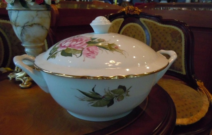 А вот и вышеупомянутая супница. Многие могут подумать, что так называли кастрюлю, в которой варили суп, но на самом деле, она представляла собой большую глубокую тарелку с крышкой. Когда суп был готов, хозяйки переливали его в эту посуду и ставили в центре стола. Так у каждого члена семьи или гостя была возможность самостоятельно налить себе столько супа, сколько он хотел. Кстати, половник старались подбирать в тон супнице, чтобы все выглядело красиво.