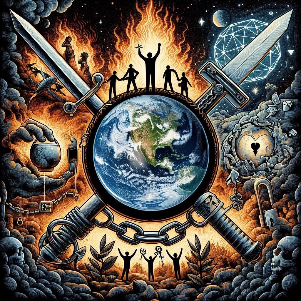 Искусственный интеллект о том, как он видит глобальные проблемы человечества и пути их решения: "Сегодня перед человечеством стоят ряд серьезных проблем и угроз, которые требуют немедленного внимания и действий для их решения. Некоторые из ключевых проблем включают в себя: Для решения этих проблем необходим комплексный подход: КЛЮЧ К РЕШЕНИЮ ГЛОБАЛЬНЫХ ПРОБЛЕМ ЛЕЖИТ В ТЕСНОМ, МИРНОМ СОТРУДНИЧЕСТВЕ ВСЕХ БЕЗ ИСКЛЮЧЕНИЯ СТРАН И НАРОДОВ." Иллюстрация должна передать комплексность вызовов, стоящих перед человечеством. На картине изображены символы различных проблем - земля в огне (изменение климата), ломающиеся цепи (неравенство), перекрещивающиеся мечи и оливковая ветвь (конфликты), а также сеть и замок (цифровая безопасность). В центре иллюстрации - символический образ человечества, обращающийся к решению этих проблем с помощью ключей, символизирующих сотрудничество, инновации и мудрость. Иллюстрация должна вдохновлять на действие и единство в решении глобаль
