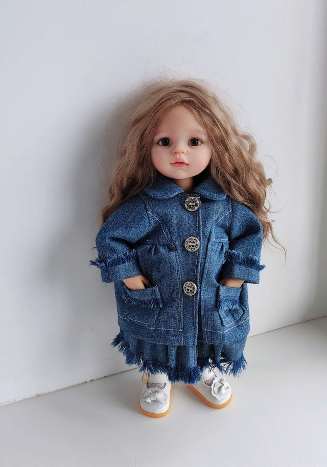 Я тоже кое что натворила. Так как осень наступила мы понемногу стали утепляться. Первой поставила нам ультиматум малышка Лизонька. Она видите ли и в деревне не была, и платье ей досталось от Мии, и вообще "Я тут самая любимая, вот и наряжайте меня". И пришлось быстренько шить ей теплую одежду, ведь маленькие тоже хотят гулять. Вот такое пальто у нас получилось, даже с кармашками, чтобы ручки не мерзли, а то когда еще варежки свяжем: Пальто у нас на подкладе Дочь собирала джинсы на что-то, вроде на сумку, а я потихоньку у нее их приХватизирую. Ведь куклам нужны и джинсы и юбочки, и даже вот пальто сшилось. Пуговки для красоты, а застёгивается на кнопочки. Пока-пока.