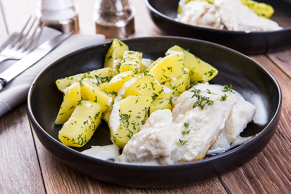 - Картофель отварите до готовности, порежьте на кусочки и подавайте вместе с треской, полив соусом. Посыпьте свежей зеленью.