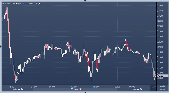 Нефть падает, поскольку трейдеры следят за прогнозами ослабления спроса и увеличения предложения. Шторм «Франсин» не оказывает большого влияния График нефти марки Brent интервалами в 15 минут Цены на нефть снизились, поскольку трейдеры следили за движением на финансовых рынках в целом, одновременно наблюдая за штормом, который может повлиять на некоторые поставки в Мексиканском заливе. Мировой эталон нефти Brent опустился на 20 центов ниже отметки 71 доллар за баррель, но к настоящему моменту вернулся к ней. В понедельник прервалась серия из шести негативных сессий. Рынки акций также борются за направление, ожидая ключевые данные по инфляции в среду и теледебаты кандидатов в президенты. Позднее на этой неделе также должны быть представлены отчеты основных агентств по прогнозированию нефти.