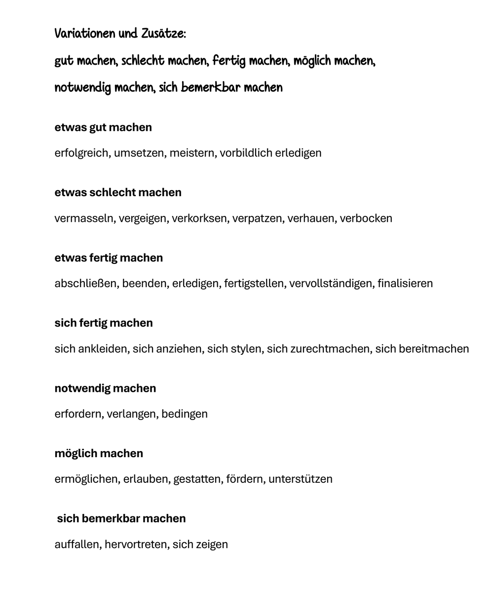 Немецкий глагол «machen» - настоящий универсал, применяемый в бесчисленных контекстах. Однако, именно из-за такой универсальности важно внимательнейшим образом следить, чтобы это самое "machen" не стояло в каждом втором, а то и первом предложении. Особенно на высоких уровнях. Знание синонимов и умение их применять полезно для всех, кто хочет достичь высот в языке. Это не только расширяет словарный запас, но и делает речь более чёткой и выразительной. Ниже вы найдёте конкретные примеры того, как можно заменить "machen" в предложении. В сложной ситуации мы должны очень быстро (machen) agieren. (действовать) Очень важно при проблемах максимально оперативно (etwas zu machen) zu handeln. (действовать) Он (macht) führt план весьма точно aus. (исполняет) Команда (macht) führt тщательное расследование durch. (проводит) Я буду это задание только завтра (machen) erledigen. (выполнять) Машина (macht) erzeugt электричество. (продуцирует, производит, генерирует, создаёт) Эта фабрика (macht) stell