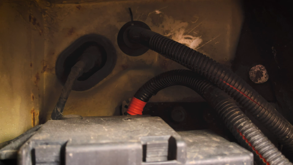 И опять проводка. Ранее мы заложили все провода, которые идут от дополнительного аккумулятора ко всем потребителям через панель управления. Теперь нужно запитать этот дополнительный аккумулятор от основного. Из салона провод ушел в подкапотное пространство через штатную заглушку, приходит к реле, которое размыкается/замыкается с кнопки в салоне и приходит к основному аккумулятору. В кабине проложили провод за обшивкой, вокруг порога, и выходит между стойкой и сиденьем уже к салону. В салоне провод идет по полу, между листами пеноплекса, что бы на него не было никакого давления.