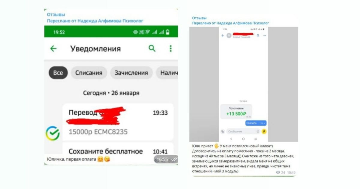Вот например моя клиентка Надежда Алфимова сделала первую продажу своей программы на теплую аудиторию на первой неделе сопровождения и следом еще несколько продаж. За счет того, что мы прописали с ней ее программу и определили четко с чем она работает и какой результат с ней получат клиенты.