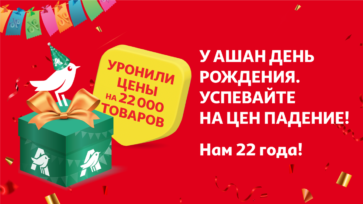 У Ашан день рождения — 22 года ударных цен. В честь праздника подготовили для вас кое-что особенное: — Настоящее цен падение! Уронили цены на 22 000 товаров. — Купоны на суперскидки. Совершайте покупки еще выгоднее! — Розыгрыш ценных призов. Суперприз — автомобиль! Чтобы участвовать в праздничном розыгрыше, используйте купоны при покупках с картой Ашан. Буклеты с купонами можно найти тут или в наших магазинах. Больше покупок с купонами — больше шансов в розыгрыше призов!