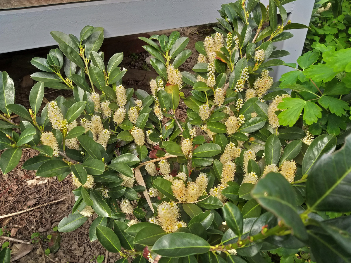 Цветение Лавровишни гибридной сорта Титан (Prunus laurocerasus Titan) в апреле 2023 года. Несколько кустов лавровишни я посадил у находящейся с южной стороны дома веранды, чтобы со временем они образовали рядом с ней пышный экран-бордюр. Какие-то кусты растут быстрее, какие-то, не получая должного количества света и влаги, набирают объём медленнее. Молодой прирост (фото сделано после цветения в мае 2024 года) имеет бронзовый оттенок и формой даже напоминает прирост чайного куста.