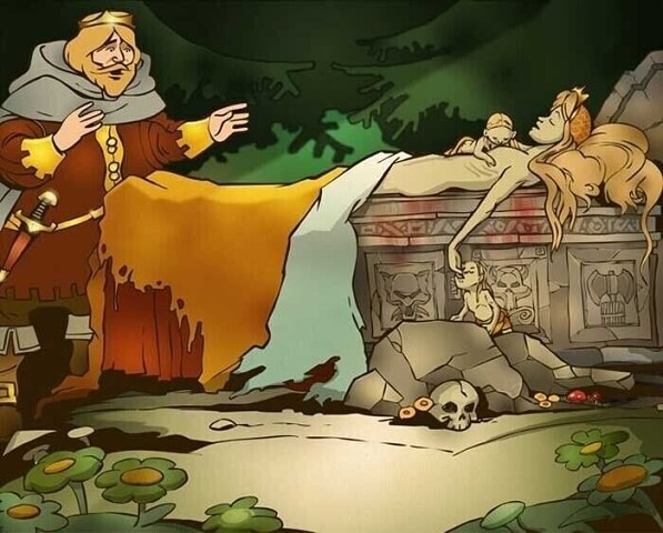 Дома у насильника обнаружилась стерва-жена, которой он, разумеется, и не думал ничего рассказывать. Злодейка все узнала сама, пыталась сжечь разлучницу и скормить мужу нагулянных детей, за что и была прибита им с особой жестокостью. Сделавшись вдовцом, король-насильник радостно женился на Спящей Красавице, его белое пальто осталось незапятнанным.