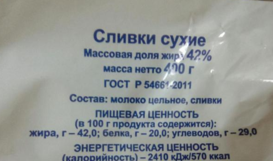 Современные технологии уже давно позволяют сохранять молочные продукты в порошкообразном виде, при этом полезные вещества не теряются. Хорошие сухие сливки изготавливаются с помощью физических, а не химических процессов. В составе только базовый ингредиент – молоко. Второсортные же производят из растительных жиров с добавлением целого спектра разных е-шек. В малых количествах это безвредно, но пользы тоже никакой не будет. И называться они будут либо «заменителем сухих сливок», либо «сухими сливками на растительной основе». Накормишка рекомендует на первом этапе разводить сухие сливки в небольшом количестве воды, чтобы минимизировать вероятность появления комочков. И уже эту массу доводить до нужного результата. Воду лучше всего использовать теплую – 35-40 градусов. Базовый порошкообразный продукт содержит 42 % жиров. Если у вас классическая 15-миллилитровая столовая ложка, в нее входит: В 5-миллилитровую чайную ложку: В 250-миллилитровый стакан: В 200-миллилитровый стакан: 120 г – до
