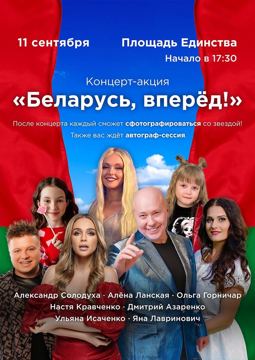 11 сентября, в преддверии Дня народного единства, на площади Единства в Могилеве состоится масштабная концерт-акция «Беларусь, вперед!». Впервые в областном центре выступят звезды белорусской эстрады: Алена Ланская, Александр Солодуха, Настя Кравченко, Ольга Горничар и Дмитрий Азаренко. Также на сцене выступят молодые таланты – Яна Лавринович и Ульяна Исаченко. Этот праздник, приуроченный ко Дню народного единства, станет символом сплоченности белорусов, уважения к памяти предков и сохранения культурного наследия. Начало мероприятия запланировано на 17:30, вход свободный. Не упустите возможность присоединиться к этому яркому событию и отпраздновать вместе!