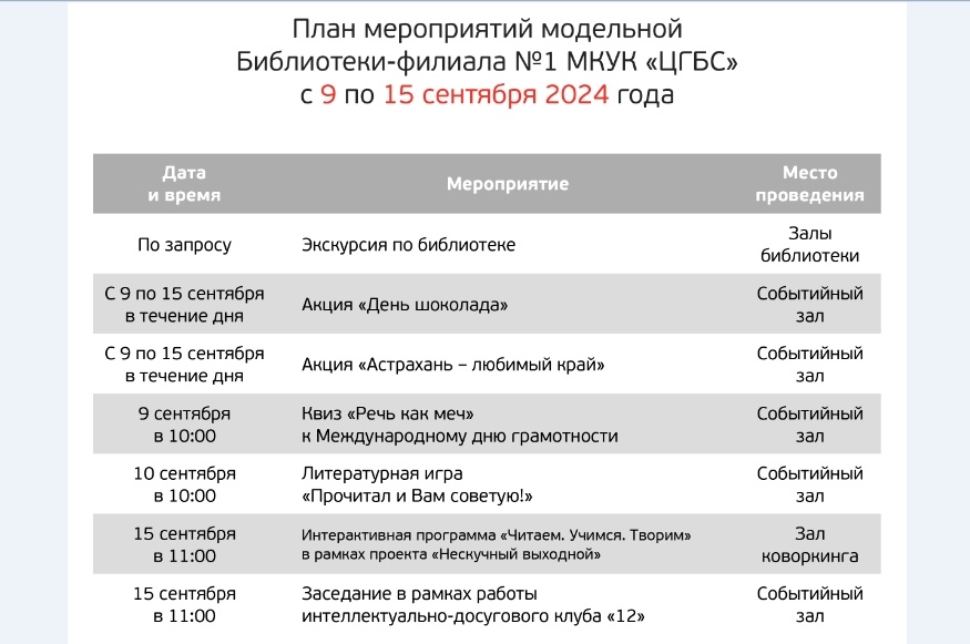 Также на этой неделе в модельной библиотеке запланирован мастер-класс по актерскому искусству для всех желающих от актера Астраханского театра юного зрителя Сергея Барова. Кроме того, будет организован городской квест «Тайна Велимира». Он пройдет по маршруту от модельной библиотеки до дома-музея Велимира Хлебникова. По пути участники будут разгадывать загадки, находя зашифрованные ответы в вывесках и достопримечательностях. Это лишь часть мероприятий, которые на этой неделе пройдут в библиотеке по ул. Шаумяна, 87 в Кировском районе. Подробная программа в карточках. Также в них рассказано о том, что ждет на этой неделе посетителей еще одной модельной библиотеки - на ул. Дзержинского, 46 в Трусовском районе, сообщает пресс-служба городской администраци