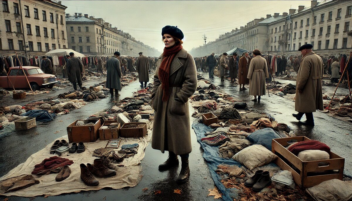 На следующий день Ольга встала рано. Она долго смотрела на свои вещи — платья, дублёнку, несколько кожаных сумок, которые теперь стали её единственным капиталом. Эти вещи ещё несколько лет назад казались ей символом успешной жизни. Она вспоминала, как носила их на работу, как гордилась своим внешним видом. Но теперь всё изменилось. Когда она подошла к рынку, её охватило чувство тревоги. Люди уже суетились у прилавков, кто-то продавал одежду, кто-то продукты, привезённые с дачи. Рынок гудел как улей, и Ольге стало не по себе. Лариса уже ждала её. Она махнула рукой, указывая на свободное место рядом с собой. — Давай, Оля, ставь свои вещи здесь, — сказала она. — Не волнуйся, всё у нас получится. Ольга разложила свои вещи на старой скатерти, которую принесла с собой. Вещи лежали аккуратно, как будто это могло придать им больше ценности. Но люди проходили мимо, едва бросая взгляд. Ольга стояла рядом с Ларисой, которая громко призывала покупателей: — Дублёнка почти новая! Платья недорого! —