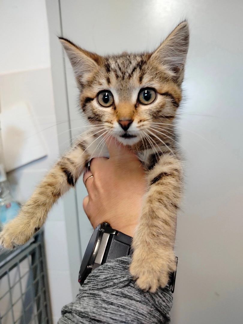 Малышку выкинули у собачьего приюта. Хорошо, что первыми нашли волонтеры, когда гуляли с собаками в окрестностях. Полосатая красотка ждёт встречи со своей семьёй. Маленькой Рысе 2 месяца, активная и игривая девчушка, ходит в лоток, обработана.