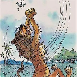 Обидел однажды Лев котёнка Гава: поймал и ни за что, ни про что начал за хвост дёргать. Выплакался Котёнок, отошел у него хвост, слезы высохли, а обида не прошла. За что пострадал? Не ровен час, опять на царя зверей налетишь! Этак хвостов не напасешься! А кому жаловаться, когда Лев сильней всех в лесу? Волк с Лисом ему первые дружки-приятели, водой не разольешь! - У кого защиты искать? - вздохнул котёнок Гав. У меня! - пискнул вдруг чей-то тонкий голосок. Обернулся котёнок Гав и увидел Комара. - Какой из тебя защитник! - сказал Котёнок. - Что ты Льву сделать можешь? Он зверь, а ты мошка! Какая в тебе сила? - А вот увидишь! - ответил Комар. Намотался Лев жарким днем по лесу. Разморило его. Устал царь зверей, прилег под кустом отдохнуть. Только глаза закрыл, слышит - над самым ухом: "Д-з-ю-ю-ю!.. Д-з-ю-ю-ю!.. Д-з-ю-ю-ю!.." Узнал Лев Комариную песню. Приготовился, стал ждать, когда Комар ему на нос сядет. Кружился, кружился Комар вокруг да около и наконец сел Льву на кончик носа. Лев недо