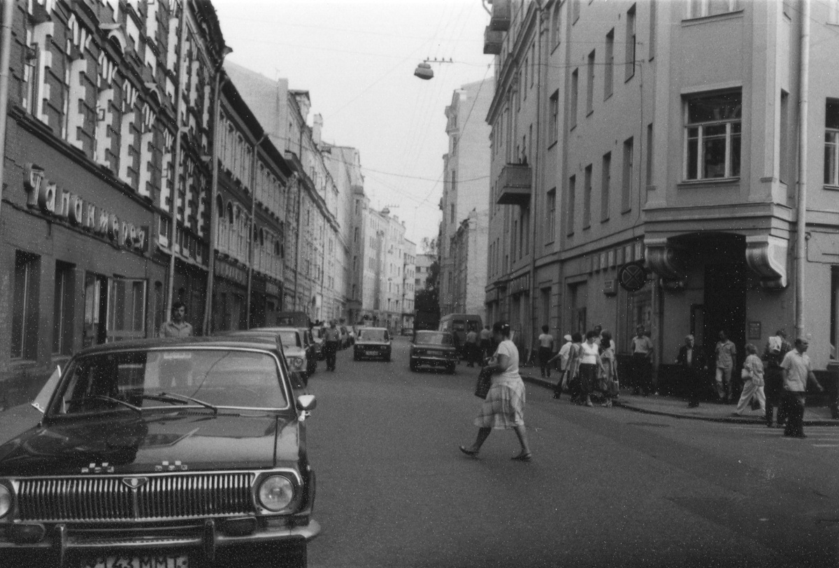 Давайте совершим очередное путешествие сквозь времени по знакомым нам улицам, посмотрим, что было тогда и как изменилось с тех пор. Поехали! ..... Вид от Пионерских прудов, ныне Патриарших, на Большую бронную улицу. Тогда она ничем особенным не отличалась от других улиц в центре города, здесь были типичные магазины, слева "Галантерея" и "Молоко", справа "Продукты" и "Овощи. Фрукты". Фото 1988 года, Michael Leetz Несколько лет назад улицу благоустроили, теперь здесь больше пространства отдано пешеходам и появилась велополоса. На первых этажах открылось много модных кафе, в которых собирается состоятельная молодёжь Ленинский проспект и знаменитый универмаг "Москва", созданный по подобию западных торговых центров. В советские годы здания и улицы обильно украшали к празднованию первомая. Фото 1982 года, Александр Карельский Здание универмага сохранилось до наших дней, а внутри сейчас обычный тц с магазинами и кафе Улица Ленивка. Здесь тогда работал магазин агропромышленного комбината, можн