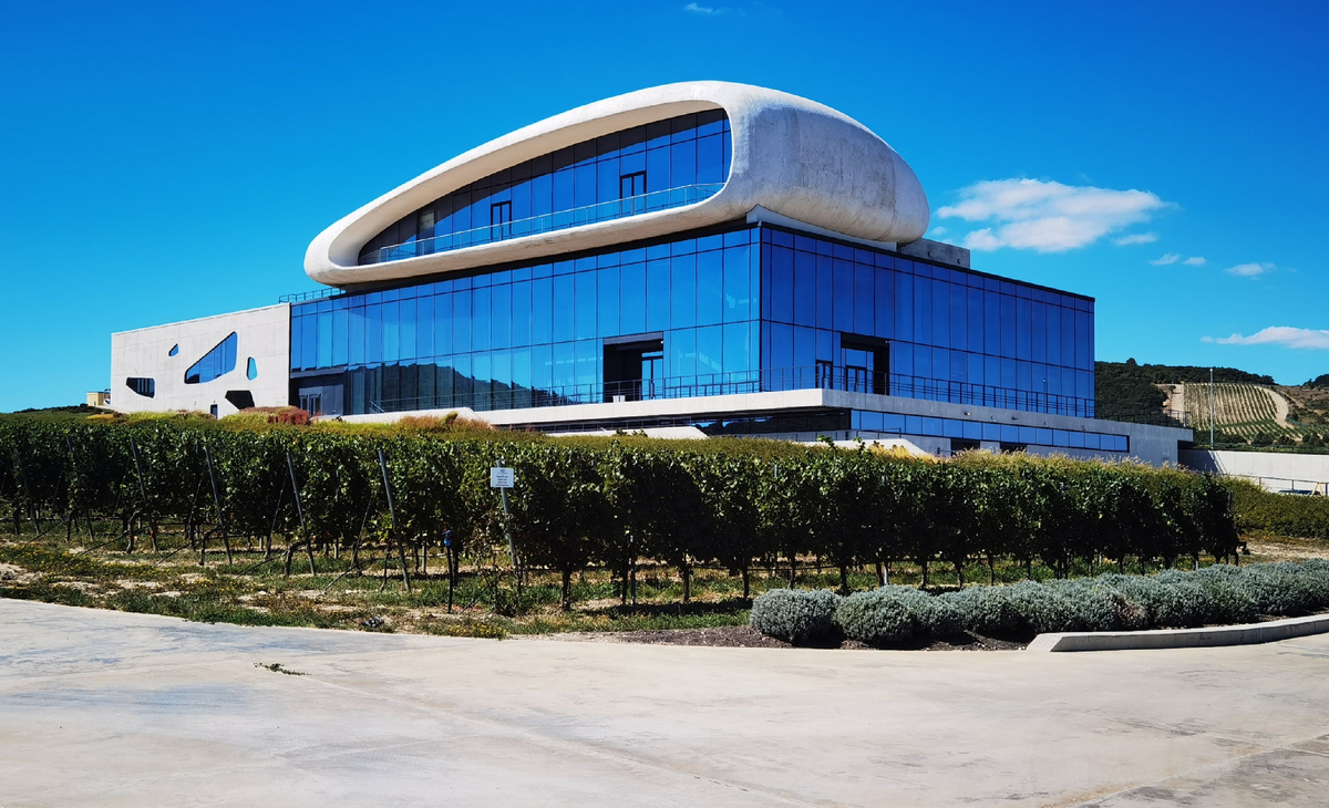 Внешняя часть винодельни и некоторые внутренние зоны выполнены из архитектурного бетона, который в отличие от обычного не требует никакой дополнительной обработки (выравнивания, шлифовки, штукатурки, облицовки и т.д.). В сочетании с синими тонированными стёклами смотрится стильно и максимально практично одновременно.