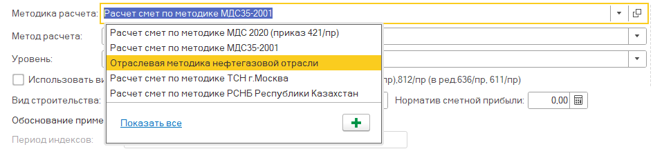 При отраслевой настройке расчета стоимости для нефтегазовой отрасли, продукт "1С:Смета" содержит два метода расчета: базисный и ресурсный. При необходимости, методы могут расширяться до базисно-индексного и ресурсно-индексного.