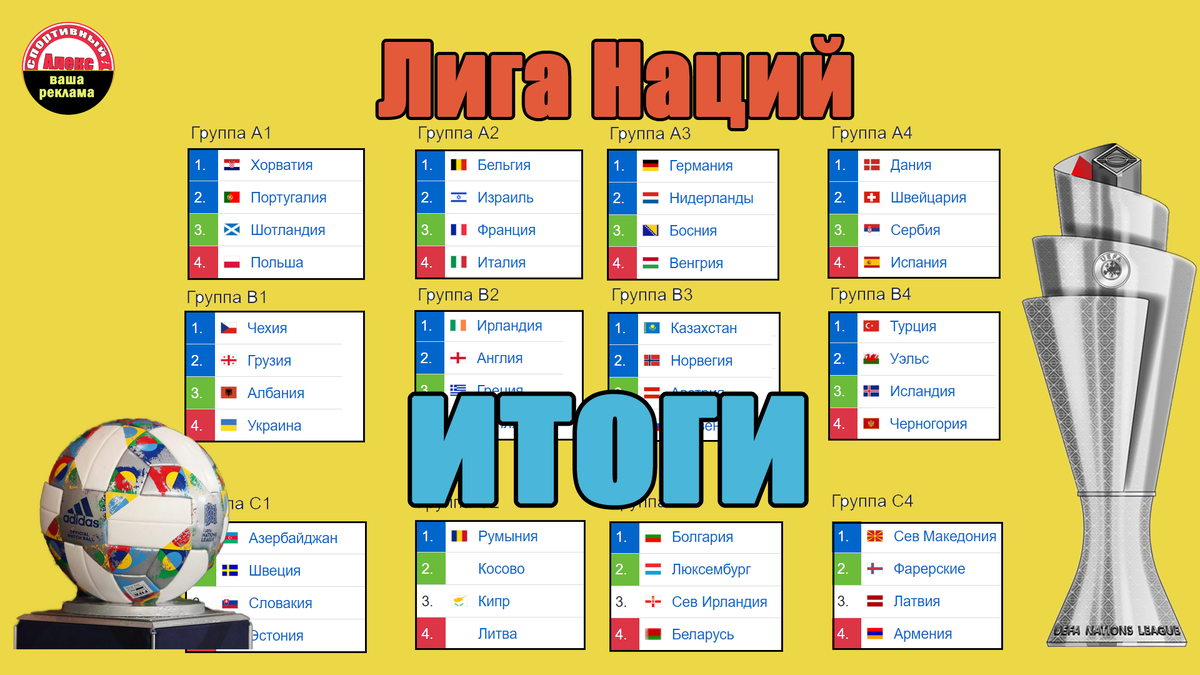 Привет, друзья. Вы на канале «Алекс Спортивный». В Лиге Наций УЕФА завершился 2-й тур. Смотрим все таблицы, подводим итоги. Дивизион А, группа 3. Венгрия - Босния - 0:0. Нидерланды - Германия - 2:2. Таблица. Германия и Нидерланды набрали по 4 очка, забили по 7 голов, но у немцев пропущено меньше, два. Они первые в таблице. Босния и Венгрия имеют по очку после очной игры. Больше в этом дивизионе игр не было, смотрим остальные таблицы после 2-х туров. * Переходим к дивизиону В, где сыграли две группы. Группа 1. Албания - Грузия - 0:1. Чехия - Украина - 3:2. Таблица после двух туров. Грузия - 6 очков. Албания, Чехия - 3 очка. Украина - 0. Группа В2. Англия за счёт дубля Кейна обыграла Финляндию - 2:0. Ирландия - Греция - 0:2. Таблица. Греция, Англия - 6 очков. Греки выше, так как забили больше мячей. Ирландия и Финляндия поборются за выживание, 0 очков. Смотрим остальные таблицы. . Переходим к следующему дивизиону. Группа С4. Латвия - Фареры - 1:0. Северна Македония в меньшинстве за