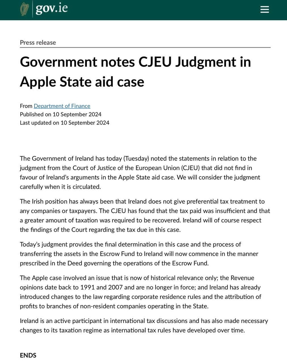 Apple оштрафована на €13 миллиардов Не успела пройти презентация, как компанию оштрафовал Европейский Союз на €13 миллиардов за уклонение от уплаты налогов в период с 2003 по 2014 год, акции сразу двинулись вниз. Постановление было принято на заседании Верховного суда ЕС. Apple обвинялась в том, что платила налог по ставке от 0,005 до 1%, тогда как стандартная ставка налога в Ирландии составляет 12,5%. Правительство Ирландии утверждает, что они не предоставляют льготный налоговый режим ни одной компании, включая Apple. Еврокомиссия выступила инициатором этого судебного разбирательства, утверждая, что Ирландия предоставила Apple незаконные налоговые льготы. Судебный процесс длился с 2016 года, и в итоге суд поддержал позицию Европейской комиссии. Сама Apple также прокомментировала ситуацию, заявив, что решение суда является попыткой оказать давление на компанию.