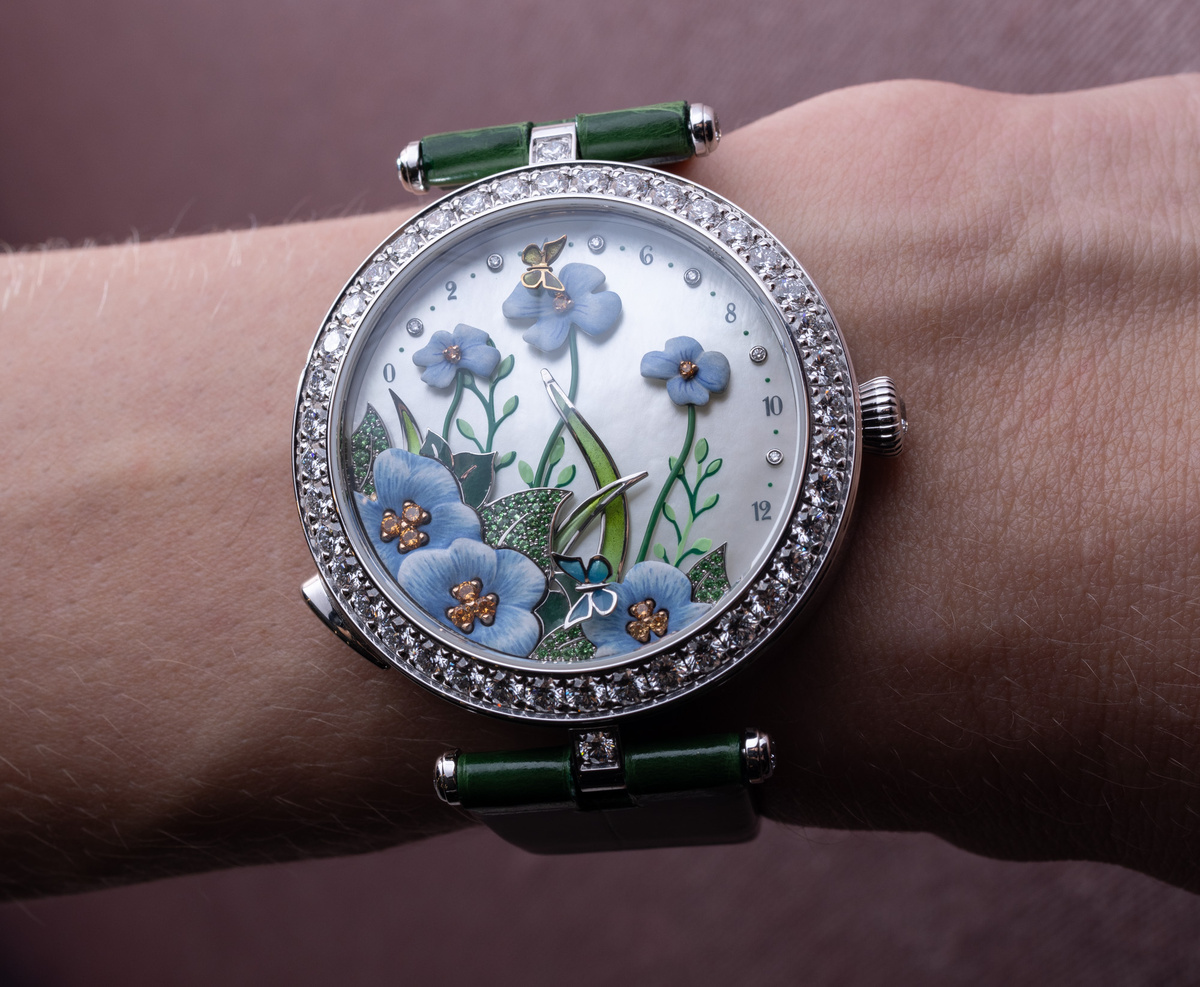 Ювелирные Chaumet с турбийоном, игривые Louis Vuitton с прыгающим часом или нежные Van Cleef & Arpels с цветочной анимацией? Будь с нами в Telegram | YouTube Друзья! Мы продолжаем обзор номинантов Женевского гран-при часового искусства. На очереди кандидаты на звание лучших женских часов с усложнениями. Часы с функцией мирового времени, облагороженные миниатюрой из эмали и перламутра. Модель представлена в корпусе из розового золота диаметром 37,8 мм. Миниатюра в центре циферблата изображает цветущую сакуру на фоне горы Фудзияма. Выпуск лимитирован серией 20 экземпляров. Стоимость часов составляет CHF 59,800. Плавные изгибы на циферблате этой модели вдохновлены разными формами движения. Пластины белого золота на циферблате инкрустированы ониксом и бриллиантами классической огранки. В отделке безеля и ушек корпуса использованы бриллианты и сапфиры багетной огранки. Корпус 40 х 14,1 мм изготовлен из белого золота. Внутри установлен механизм с ручным подзаводом, запаса хода которому хвата