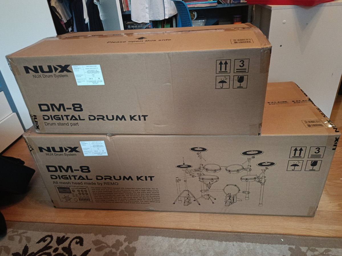 Вот уже почти три месяца как я занимаюсь в барабанной школе и учусь играть на ударной установке. Но занятия только раз в неделю, а играть хочется каждый день. Поэтому было принято решение о покупке электронной ударной установке, модель была выбрана Nux dm-8, тем более, что в Бластбите на неё была хорошая цена и рассрочка на полгода. Установка приехала в двух больших коробках. В коробке поменьше - рама из металлических трубок и пластиковых соединений для них, а также стойки для рабочего барабана, хай-хэта и держатели для тарелок. Инструкции в верхней коробке не обнаружилось, поэтому собирал раму по картинке, на благо всё просто и понятно. На самих трубках рамы уже закреплены кронштейны для барабанов и цифрового модуля. На вертикальных стойках - места для держателей тарелок. Во второй коробке - самой большой, упакованы сами барабаны, цифровой модуль ("мозги") установки и кабели. Следующим шагом был собран бас-барабан (бочка) и установлен на стойку барабан малый. Конкретно в этой установк