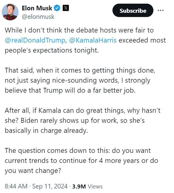 Илон Маск: Камала Харрис явно превзошла ожидания большинства
