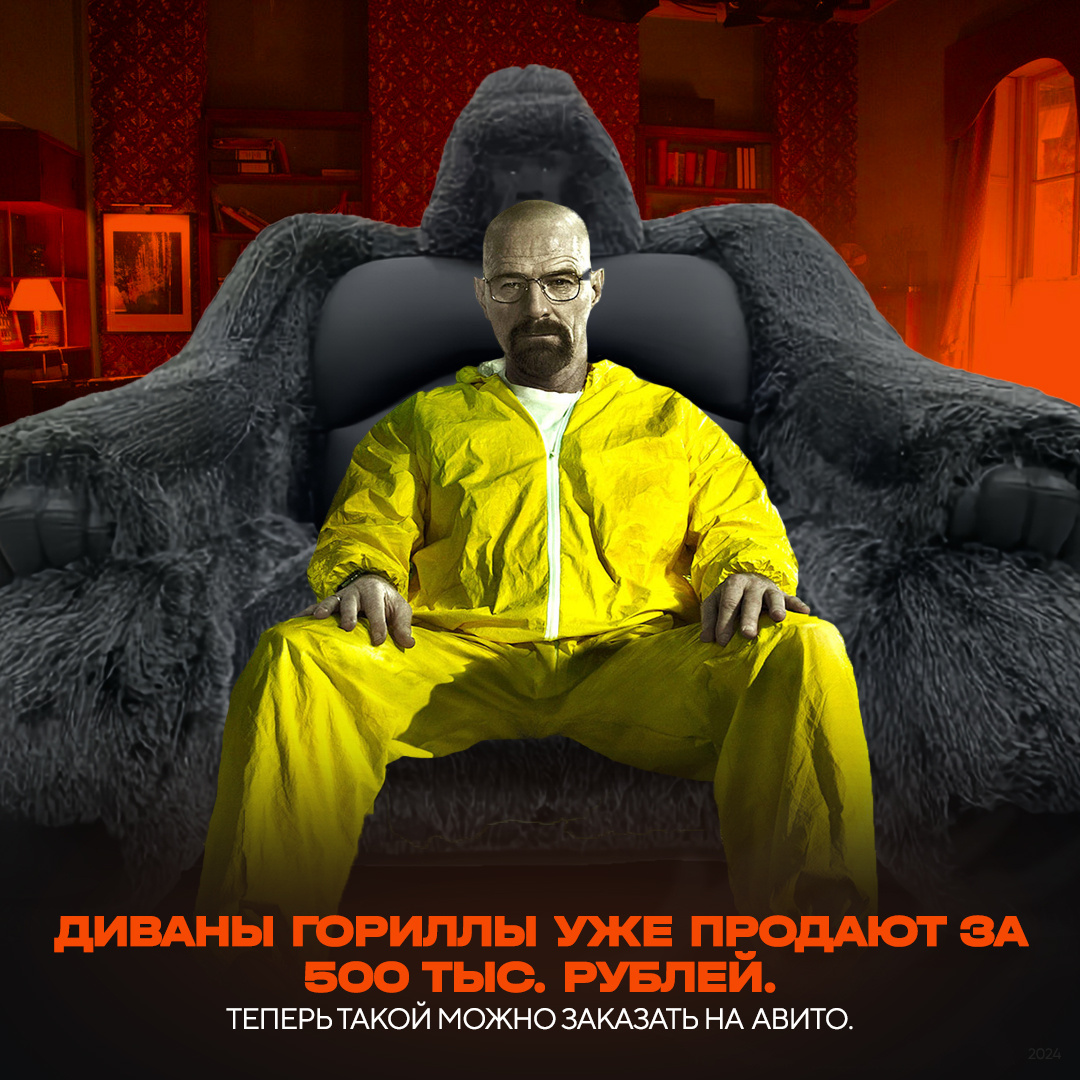 Диваны-гориллы уже продают за 500 тыс. рублей. Еще недавно их генерили с помощью нейронок, а теперь такой можно заказать на Авито.
