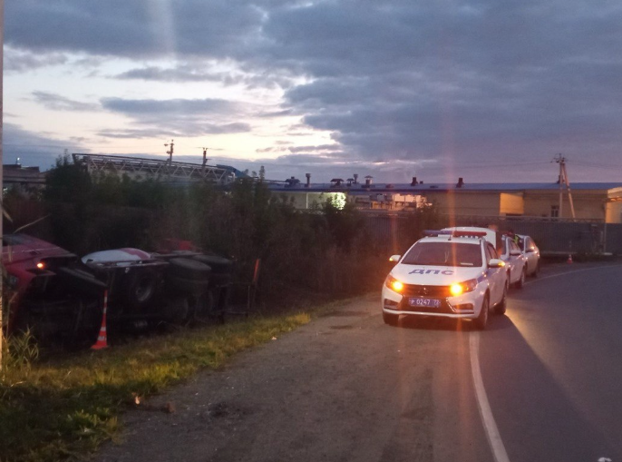 В Ишиме пьяный водитель цементовоза опрокинулся в кювет. ВИДЕО