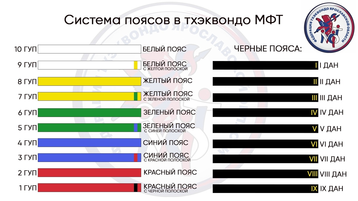 Система поясов в тхэквондо МФТ во многом отличается от других боевых искусств. И чтобы было понятнее, мы создали вот такую схему.
